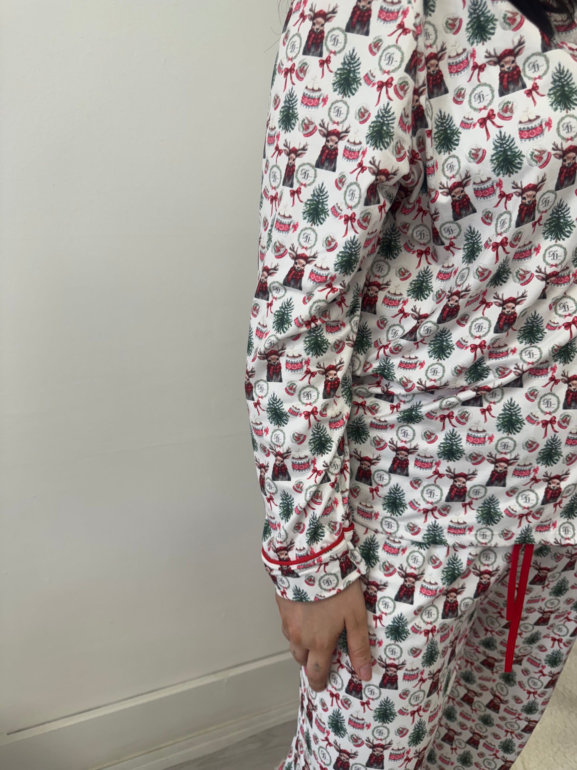Milk silk fabric making them super soft. Wear them for lounging about or sleeping these are super comfortable.A unique Christmas print you won’t find anywhere else. Red piping and a drawstring waist with added pockets are just a few of the details on our pyjamas.